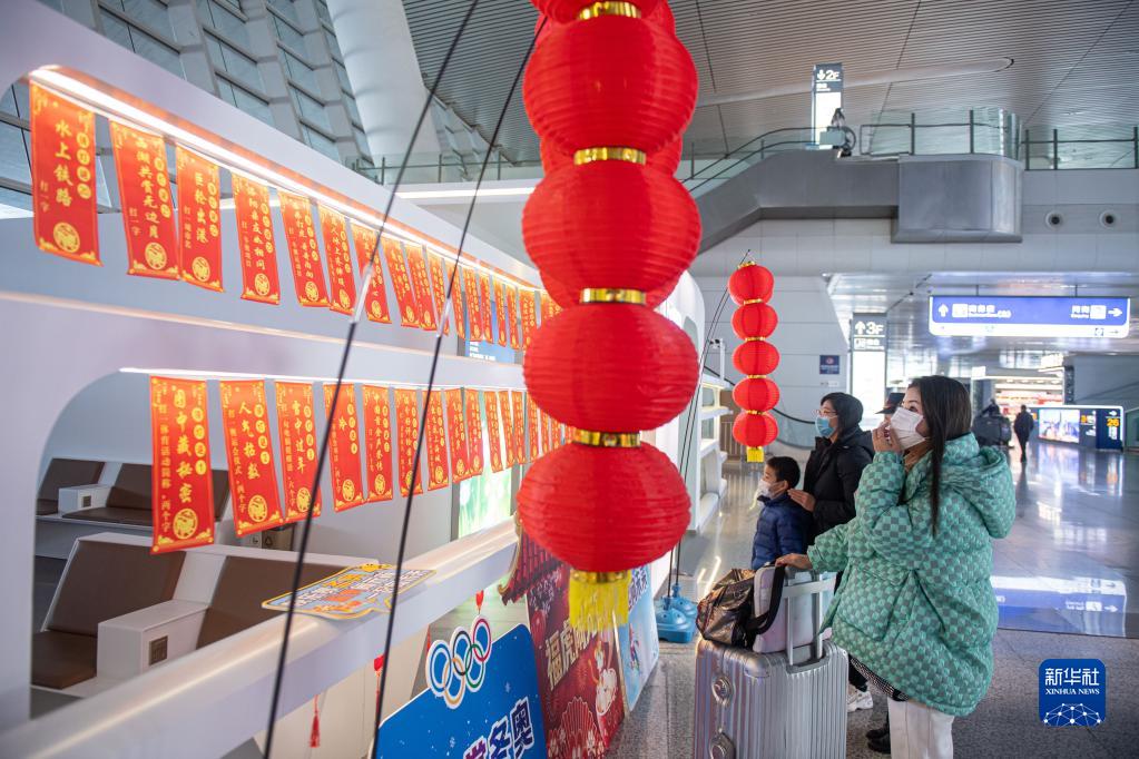 2月14日,旅客們?cè)诤贾輺|站候車室內(nèi)猜燈謎。