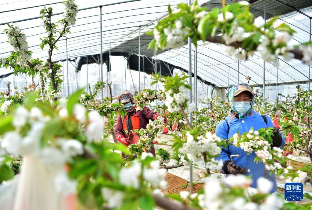 3月9日,在河北省石家莊市鹿泉區(qū)山尹村鎮(zhèn)的櫻桃種植基地,當地農民進行櫻桃花授粉。