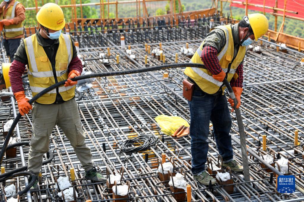 4月19日,施工人員在澆筑現(xiàn)場(chǎng)作業(yè)。