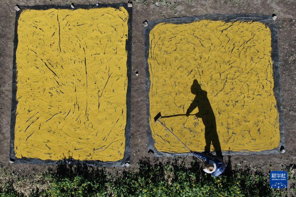7月3日,在青海省海北藏族自治州門源回族自治縣,馮躍宣在晾曬花粉(無(wú)人機(jī)照片)。