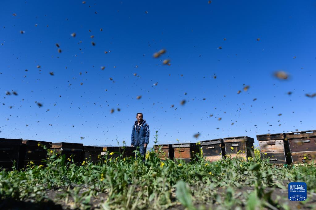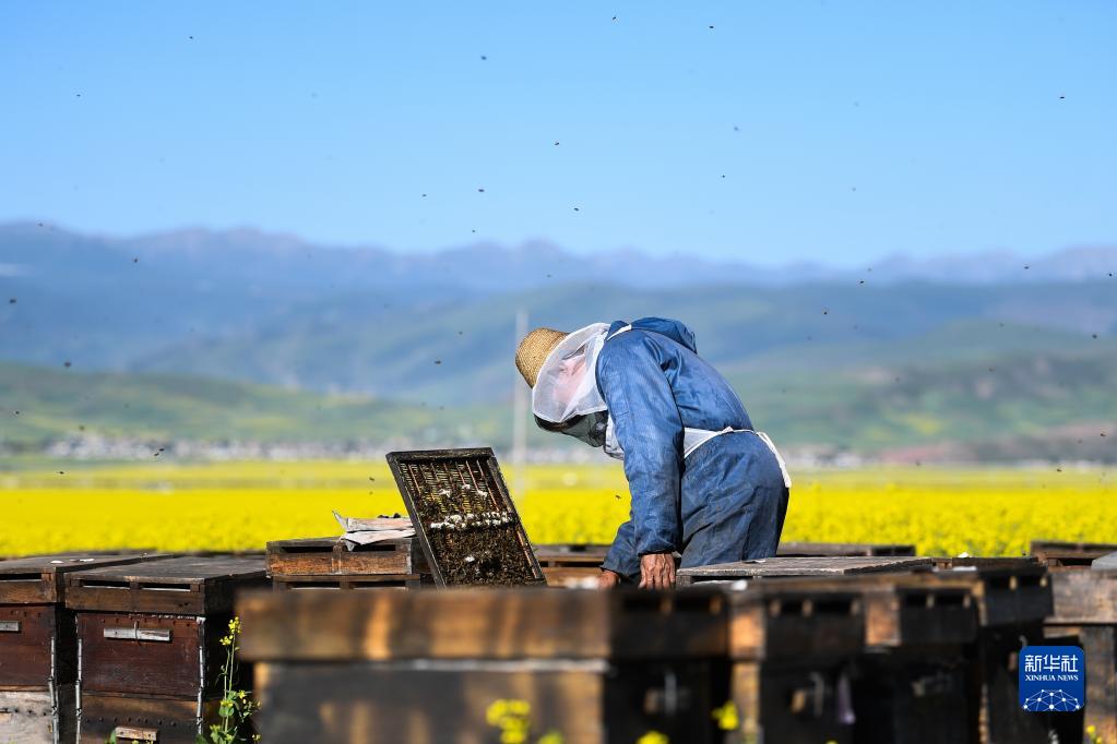 7月2日,在青海省海北藏族自治州門源回族自治縣的花田中,馮躍宣在查看蜜蜂。