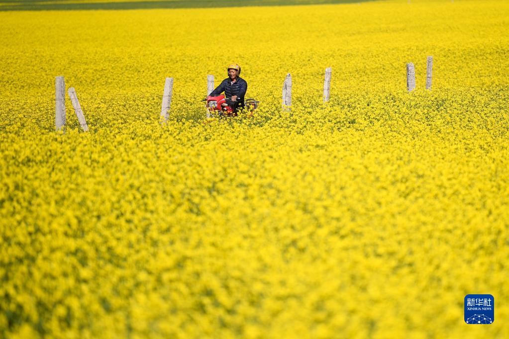 進(jìn)入七月,位于青海省海北藏族自治州門源回族自治縣的萬(wàn)畝油菜花競(jìng)相綻放。來(lái)自四川德陽(yáng)的蜂農(nóng)馮躍宣在花海里忙碌。他從早上7點(diǎn)開始整理蜂箱、采集花粉、晾曬花粉,一直忙碌到晚上8點(diǎn)。
