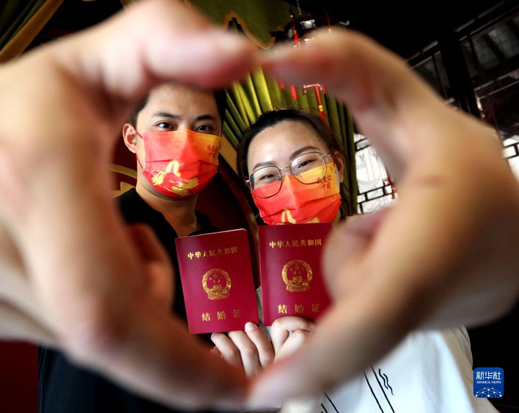 8月4日,在河北省石家莊市欒城區(qū)民政局婚姻登記處,一對新人領(lǐng)取結(jié)婚證后拍照留念。