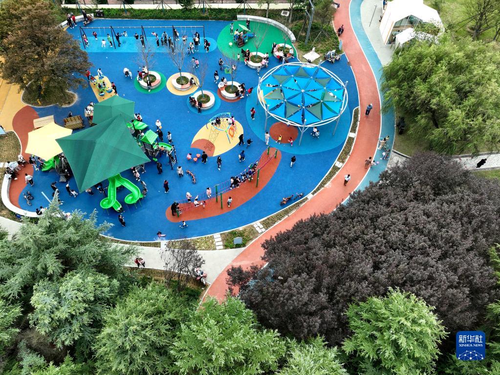 10月6日,青少年在山東青島西海岸新區(qū)雙珠公園游樂場(chǎng)玩耍(無人機(jī)照片)。