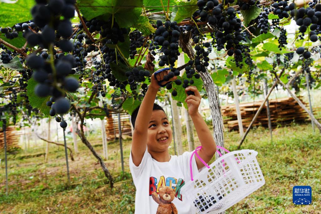 10月6日,小朋友在貴州省黔南布依族苗族自治州福泉市陸坪鎮(zhèn)羅坳村一處果園里采摘葡萄。