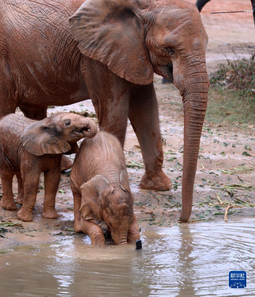 11月3日,兩頭新生非洲象寶寶在媽媽陪伴下玩紅泥。