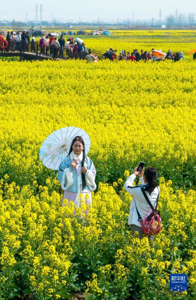 3月19日,游客在江蘇興化千垛菜花風景區(qū)賞花拍照(無人機照片)。