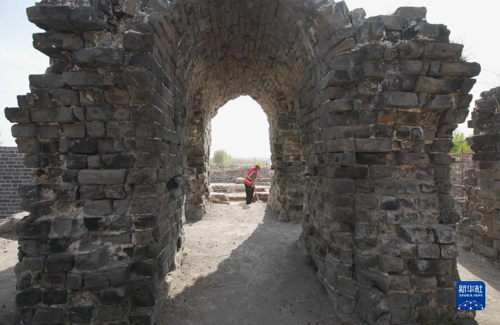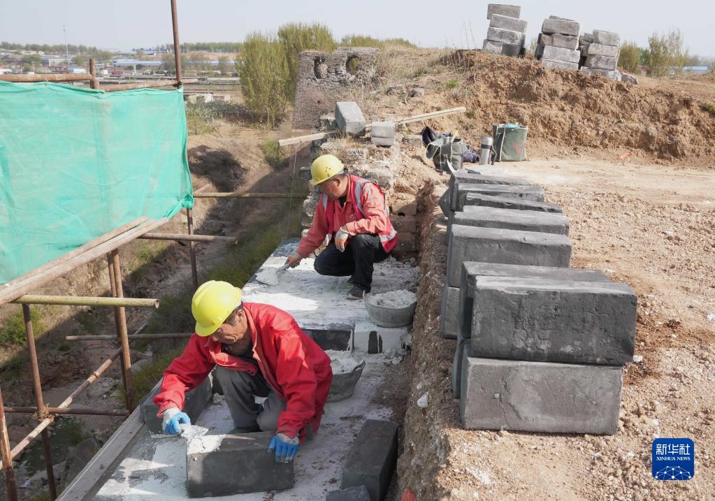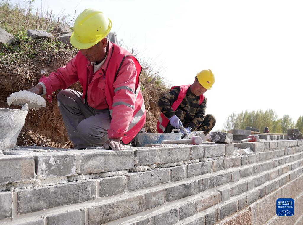 4月19日,工人在山海關(guān)長(zhǎng)城北翼城修繕工程工地施工。