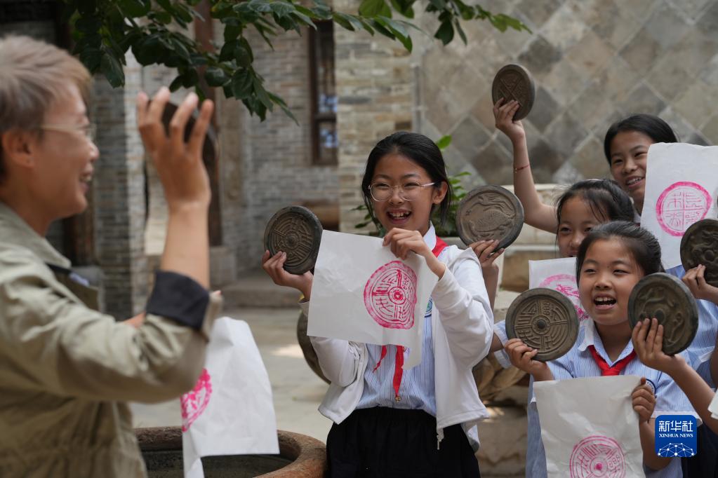 5月18日,小學生在河北省石家莊市新華區(qū)一家清代建筑博物館體驗瓦當拓片。