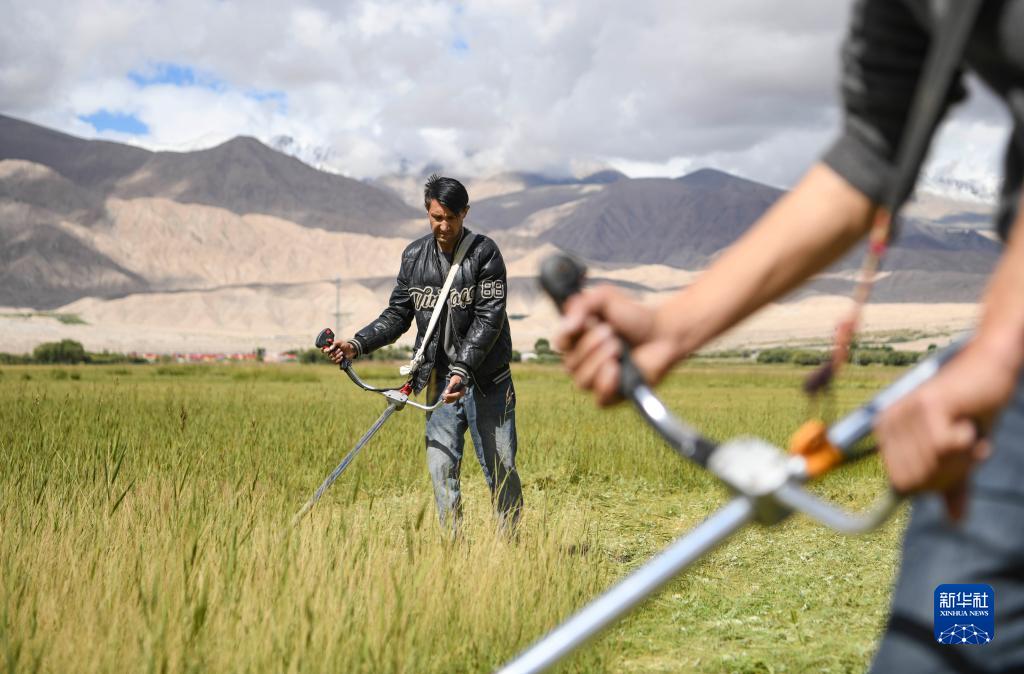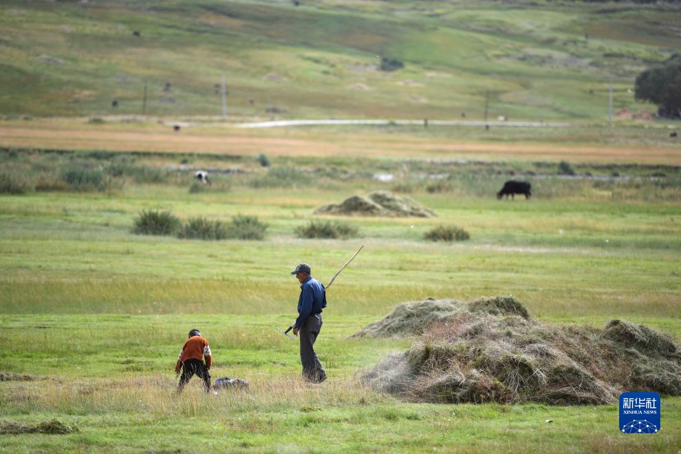 牧民在新疆塔什庫爾干塔吉克自治縣塔合曼鄉(xiāng)的草場(chǎng)上收割牧草(8月27日攝)。