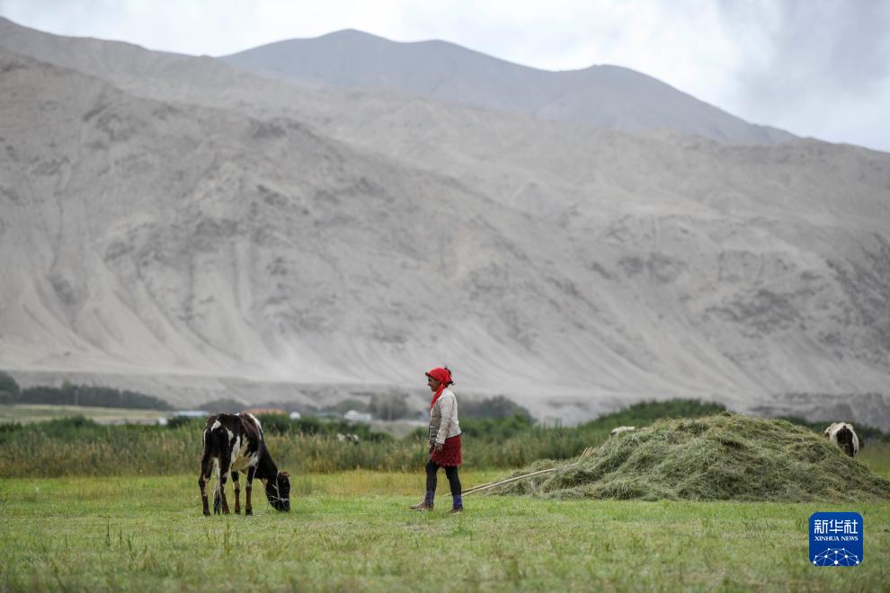 在新疆塔什庫爾干塔吉克自治縣瓦恰鄉(xiāng),打草的牧民在牧場(chǎng)上放牧(8月28日攝)。
