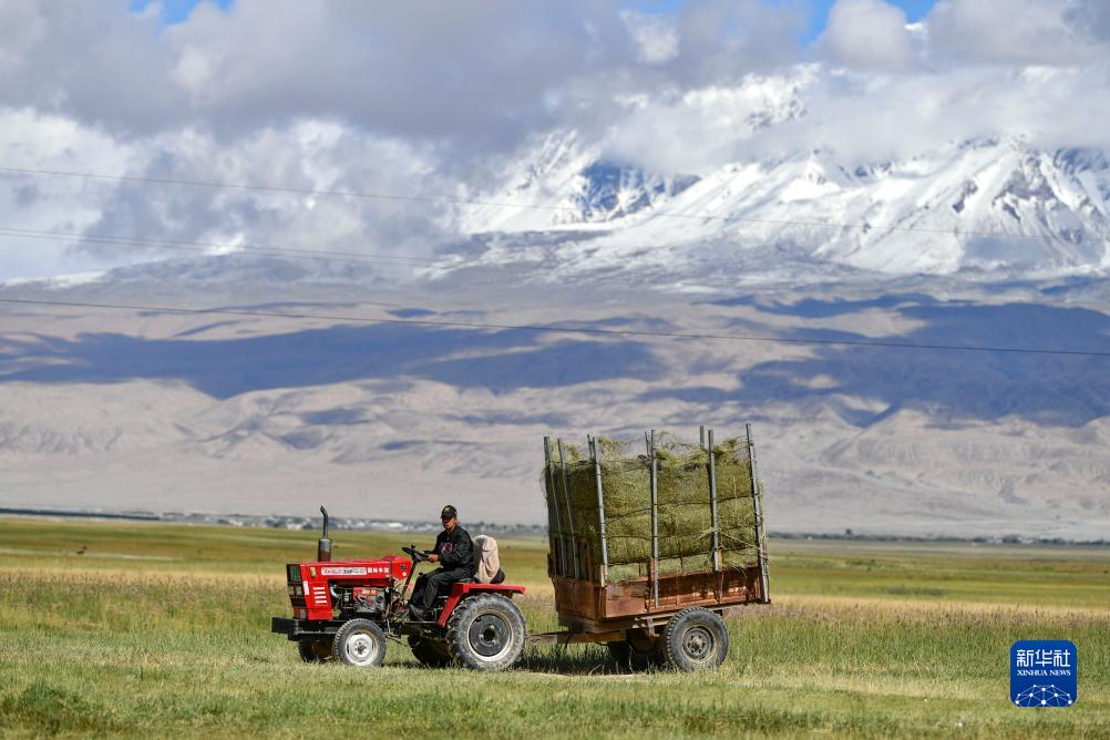 在新疆塔什庫爾干塔吉克自治縣塔合曼鄉(xiāng),牧民沙依爾開著滿載牧草的拖拉機(jī)行駛在草場(chǎng)上(8月27日攝)。