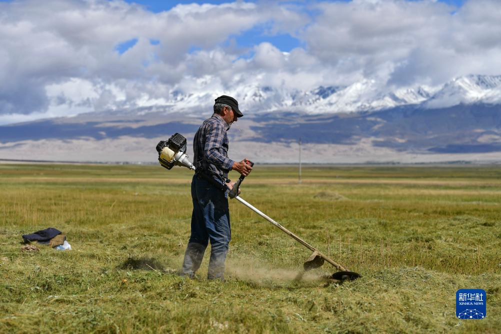 牧民吾拉木在新疆塔什庫爾干塔吉克自治縣塔合曼鄉(xiāng)的草場(chǎng)上收割牧草(8月27日攝)。