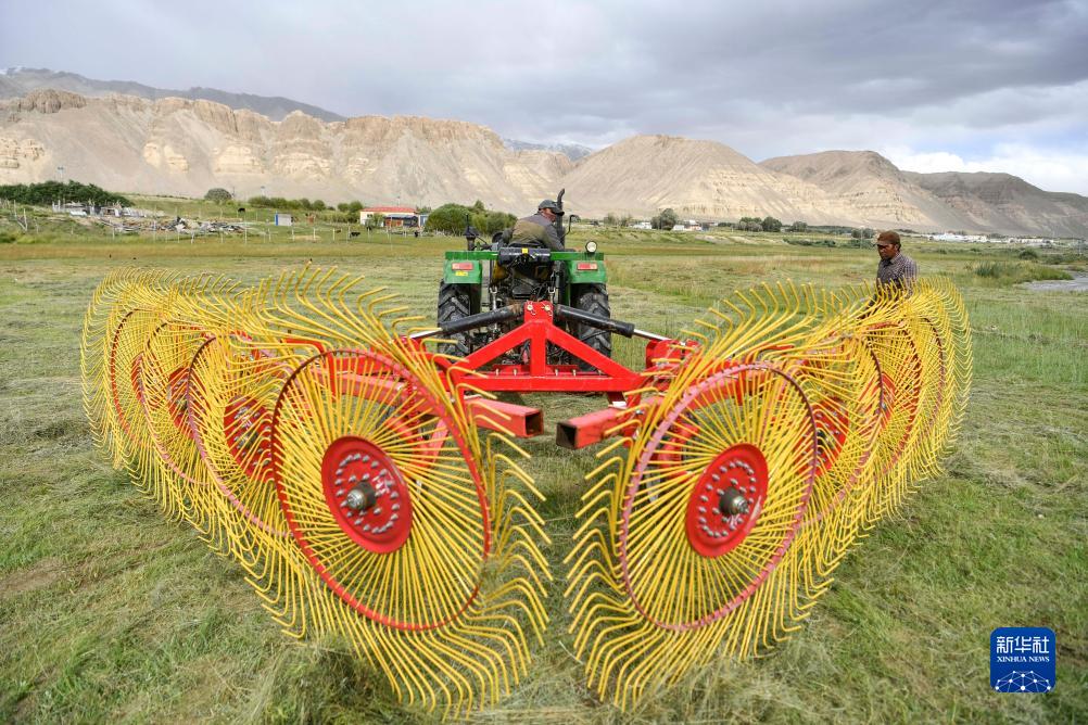 在新疆塔什庫爾干塔吉克自治縣瓦恰鄉(xiāng),牧民調(diào)試收割牧草的機(jī)械(8月28日攝)。