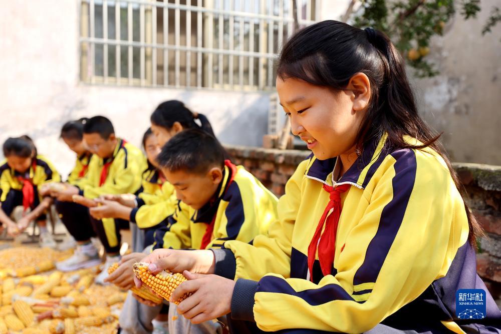 10月16日,山東省棗莊市東山陰小學(xué)學(xué)生在農(nóng)家小院幫農(nóng)民搓玉米。