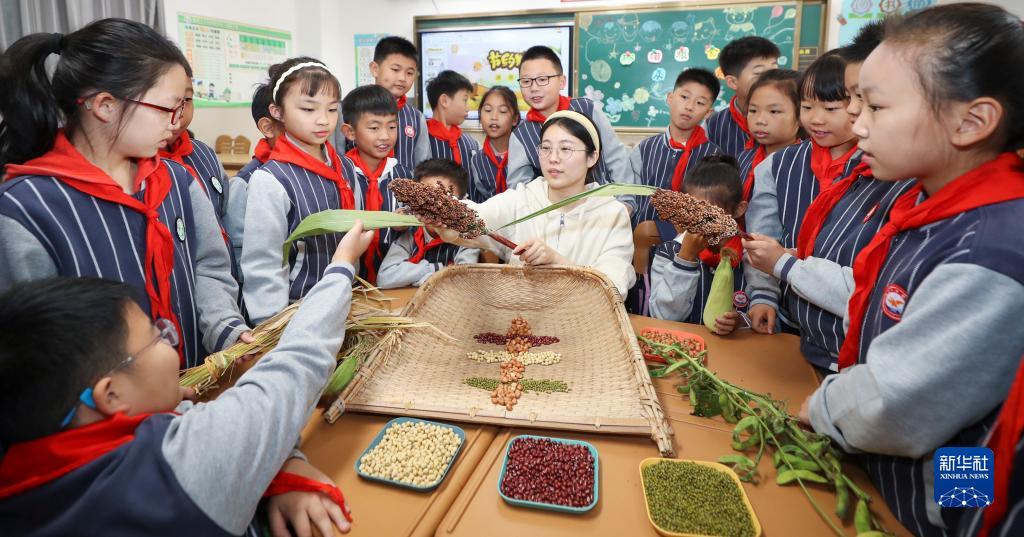 10月16日,江蘇省淮安市生態(tài)文旅區(qū)沁春路小學(xué)的老師帶領(lǐng)學(xué)生辨識(shí)糧食。
