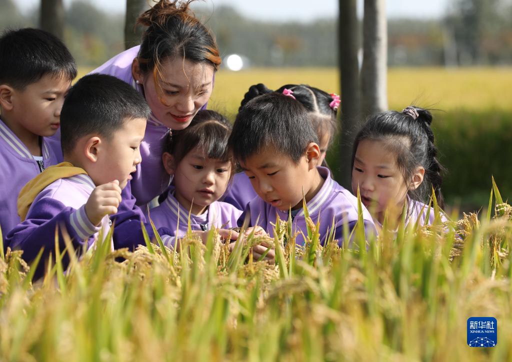 10月16日,江西省新余市渝水區(qū)下村鎮(zhèn)中心幼兒園的教師帶領(lǐng)孩子走進(jìn)稻田,了解水稻知識(shí)。