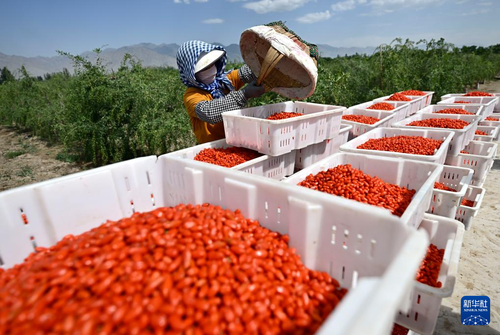 6月12日,采摘工將采摘的枸杞集中裝箱。