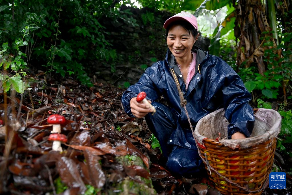 7月3日,云南省文山壯族苗族自治州文山市東山鄉(xiāng)小馬廠村的村民在林間采摘野生食用菌。