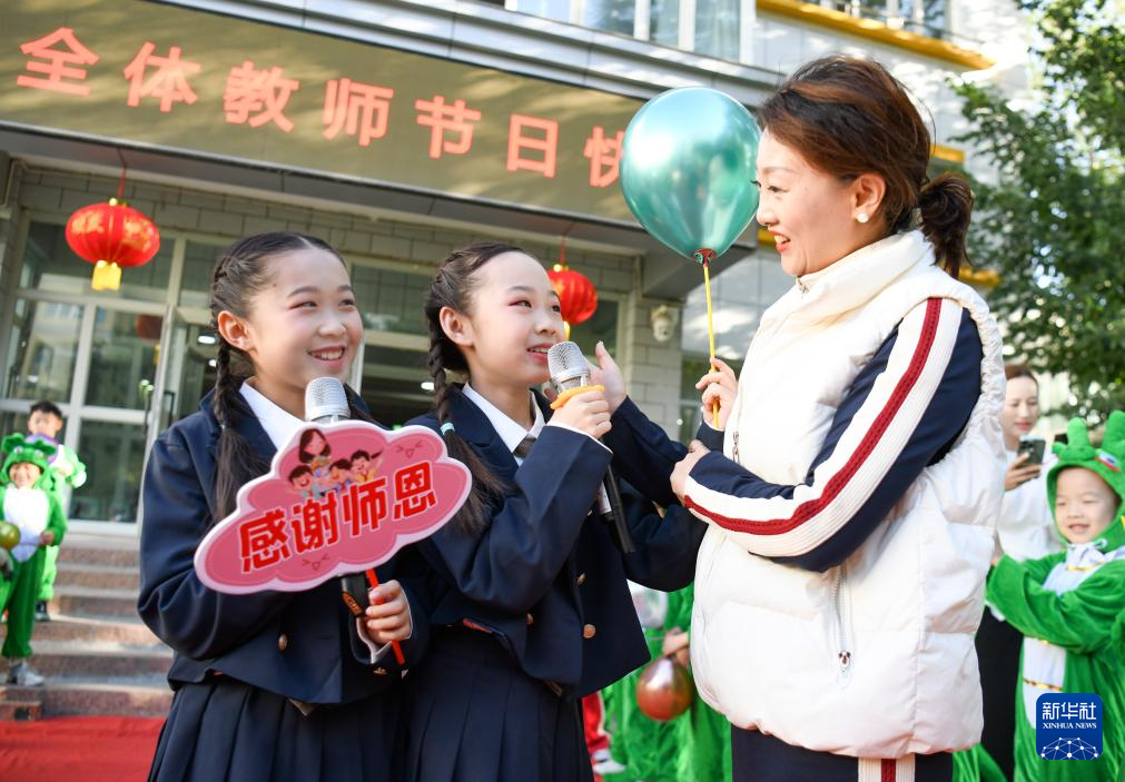 9月10日,在新疆教育學(xué)院實驗小學(xué)校園,學(xué)生為老師獻(xiàn)歌送上祝福。