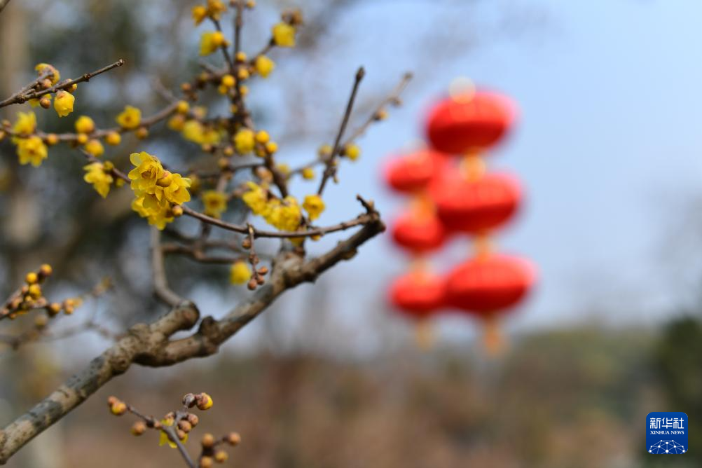 1月5日,在江蘇無錫梅園,綻放的臘梅與大紅燈籠相映成景。