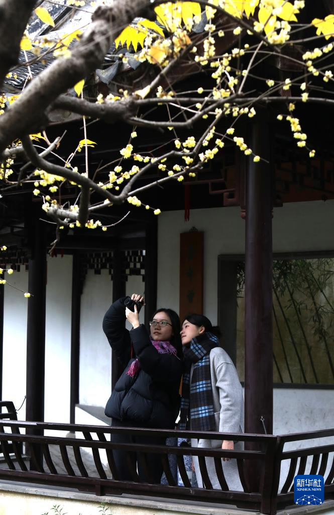 1月5日,在江蘇蘇州古典園林留園,游客在拍攝綻放的臘梅。