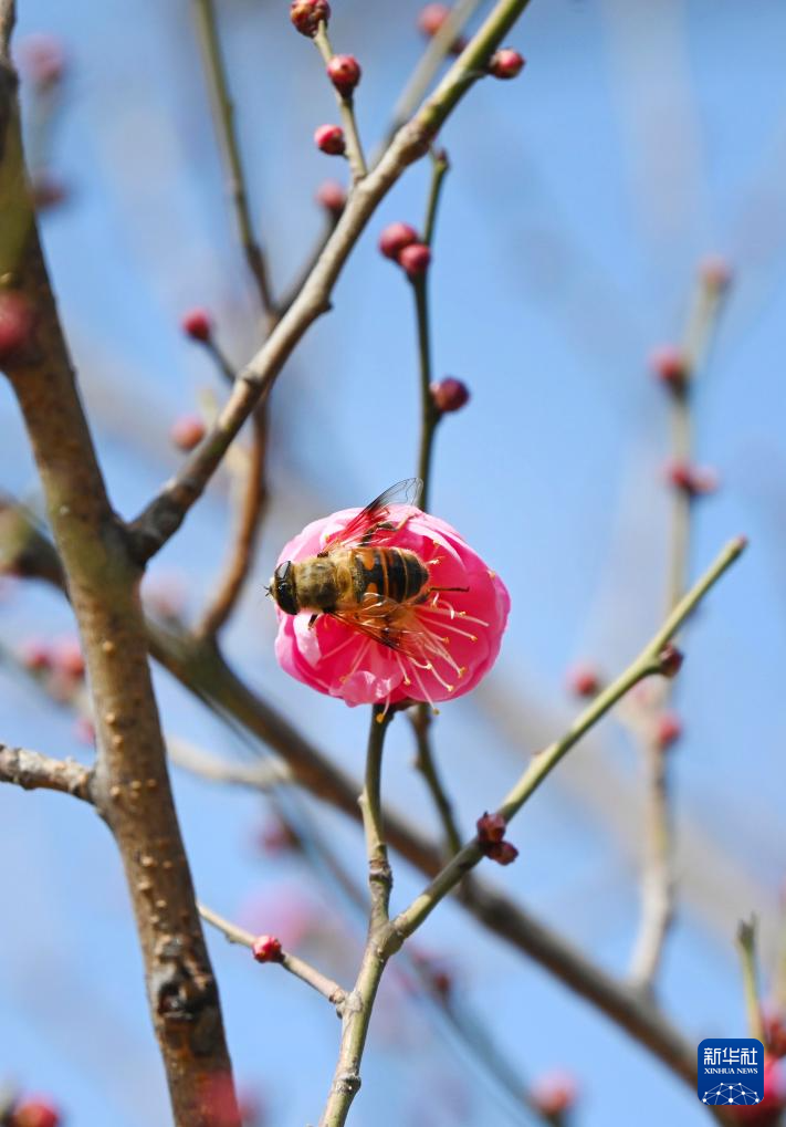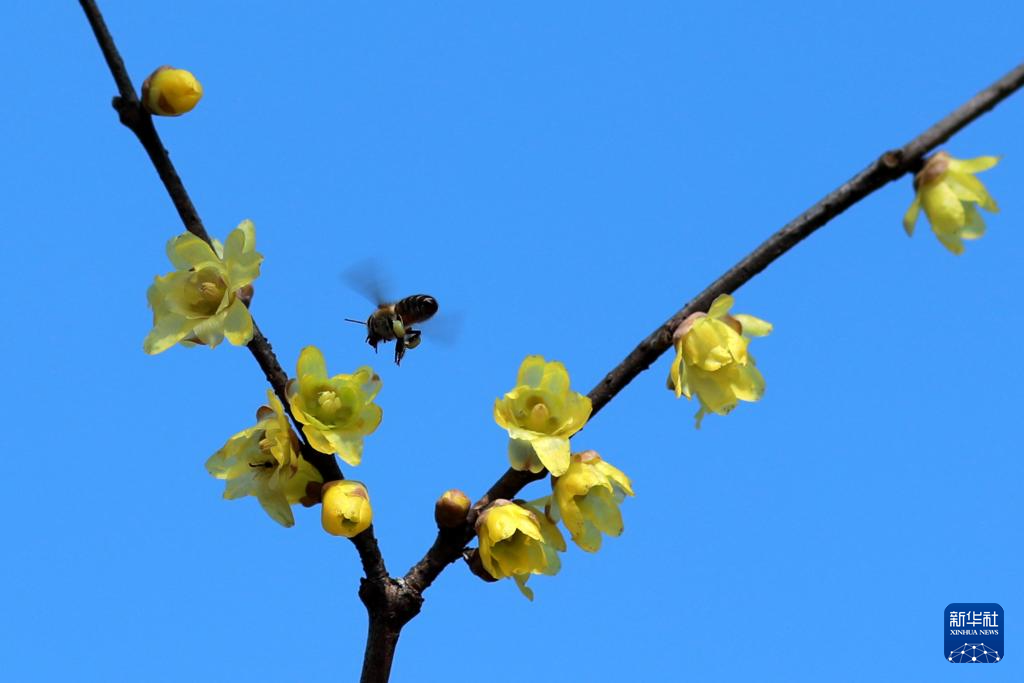 1月5日,在貴州省黔南布依族苗族自治州都勻市南沙洲公園,蜜蜂在臘梅花間飛舞。