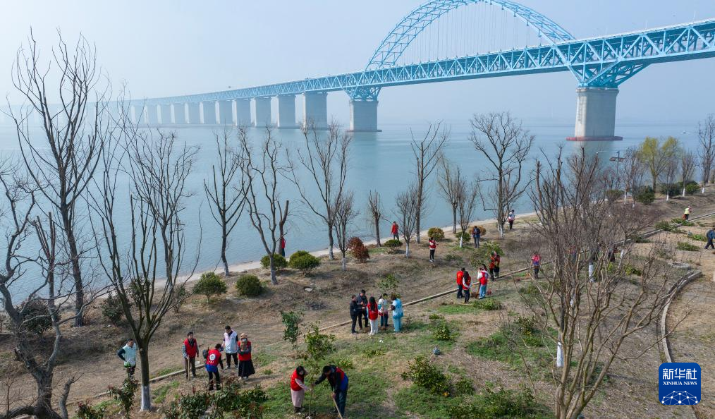 3月11日,在江蘇省南通市通州區(qū)平潮鎮(zhèn),志愿者在長(zhǎng)江岸邊植樹(shù)(無(wú)人機(jī)照片)。