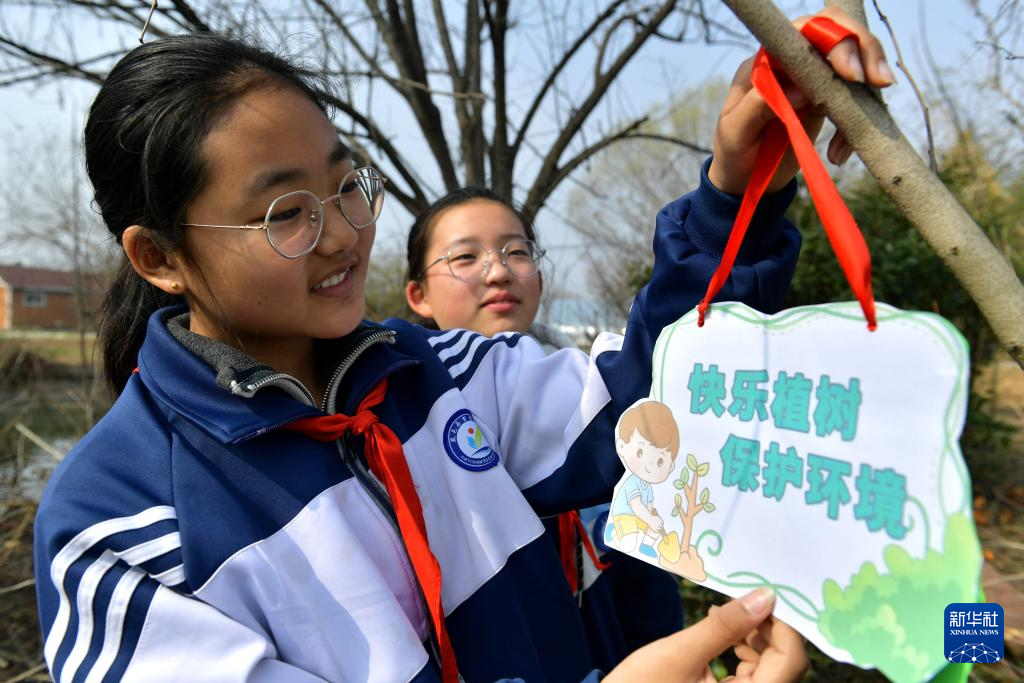 3月11日,小學(xué)生在河南省商丘市夏邑縣育才學(xué)校教育實(shí)踐基地參加義務(wù)植樹(shù)護(hù)樹(shù)活動(dòng)。