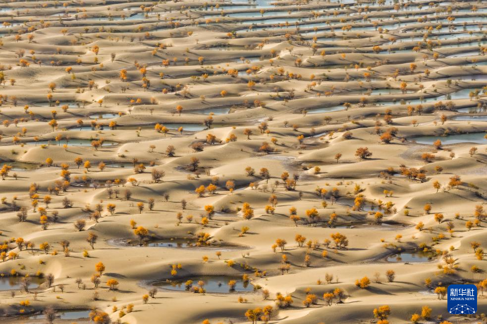 時(shí)下,新疆和田地區(qū)的胡楊迎來最佳觀賞期,成片換妝的胡楊林與水天相映,共繪金秋美景。