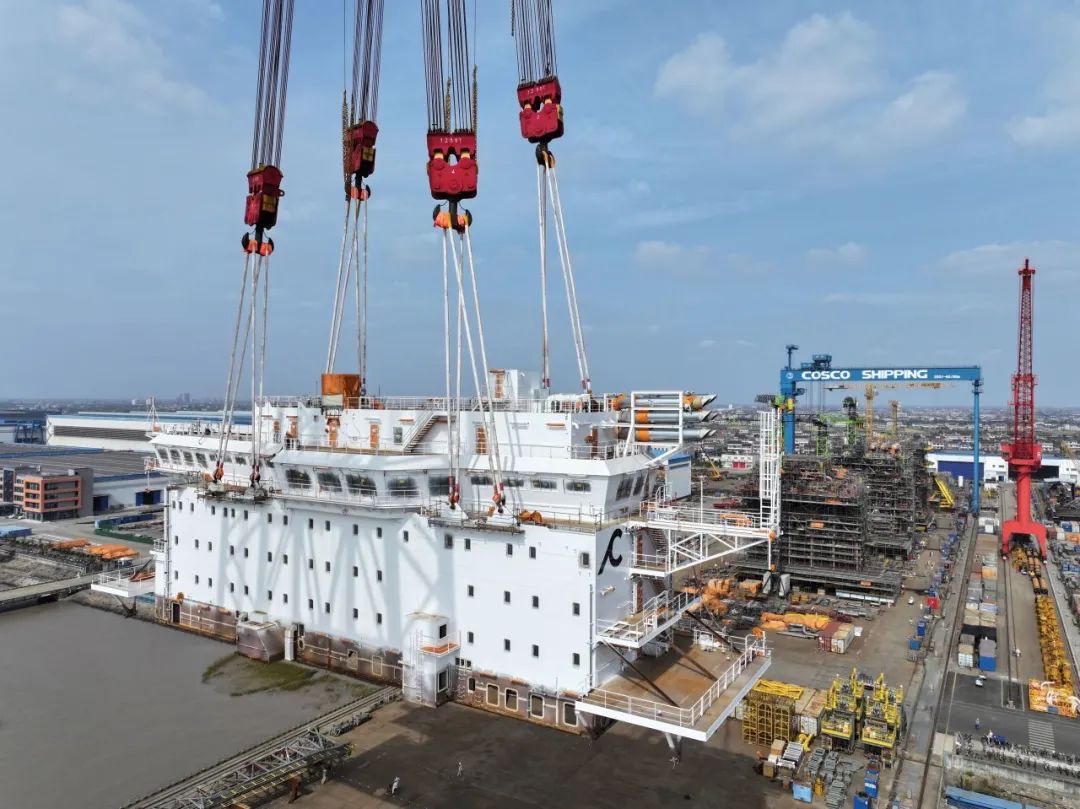 日前,啟東中遠海運海工N1063項目完成生活區(qū)完整性吊裝重大節(jié)點。從2月中旬至10月底,歷時八個半月,從開始搭載到生活區(qū)完整性交付和整體吊裝。是啟東中遠海運海工目前為止海工建造項目周期性最短、完整性最高的生活區(qū)項目。